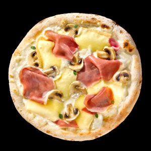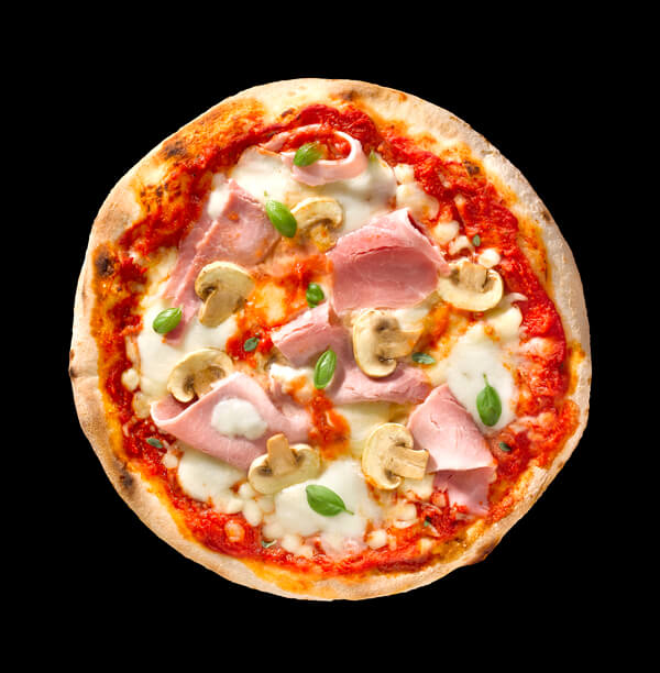 Pâte artisanale, sauce tomate à l’origan, mozzarella, jambon, champignons et basilic